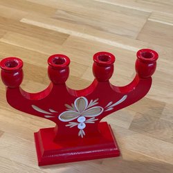 Röd adventsljusstake i trä med plats för tre ljus. En fin dekoration till jul. Den är röd och mörkgrön.
