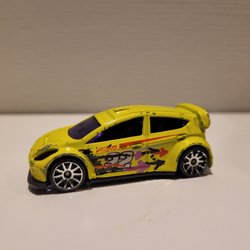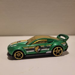 Ljusblå Hot Wheels bil med svart motorhuv och röd rand. Bilen har en vinge och guldfärgade fälgar.