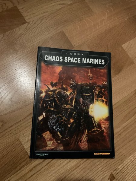 Codex - Chaos Space Marines, oklart vilken version. Jag kom inte längre än såhär i den obskyra och grymma framtiden utan höll mig till tomtar och troll istället.