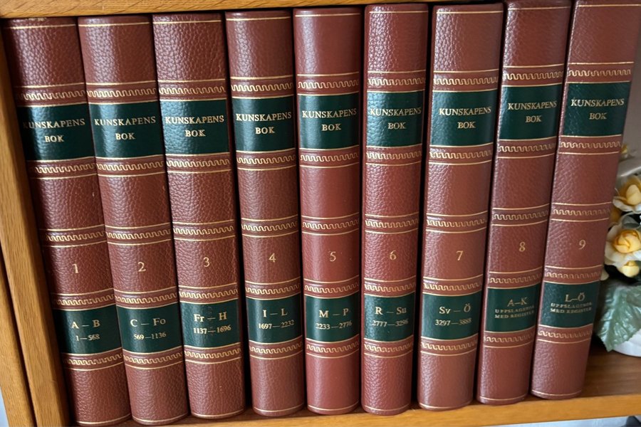 En komplett uppsättning av Kunskapens Bok i 9 volymer. Varje volym är märkt med bokstäver som indikerar innehållets omfång, till exempel A-B, C-Fo, Fr-H, I-L, M-P, R-Su, Sv-Ö, A-K (uppslagsbok med register) och L-Ö (uppslagsbok med register).