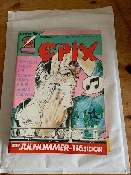 oläst men ej i nyskick. Epix Nr 12 från 1987, julnummer med 116 sidor. Komplett album om osannolika odjur av Max Cabanes.