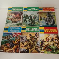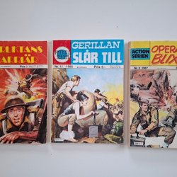 Samling av serietidningen Action Serien, inkluderar nummer 11 (Olycksfågeln Jim) från 1983, nummer 4 (Skräckens Stad) nummer 5 (Till Varje Pris) från 1982, nummer 6 (Slaget vid Rougelap) från 1982 och nummer 12 (Slåss för Äran) från 1986. Cirka FN-skick på samtliga. Samfraktar