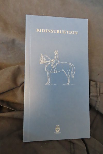 En bok med titeln "Ridinstruktion" som innehåller information om ridning. Boken har en illustration av en ryttare på en häst på omslaget.