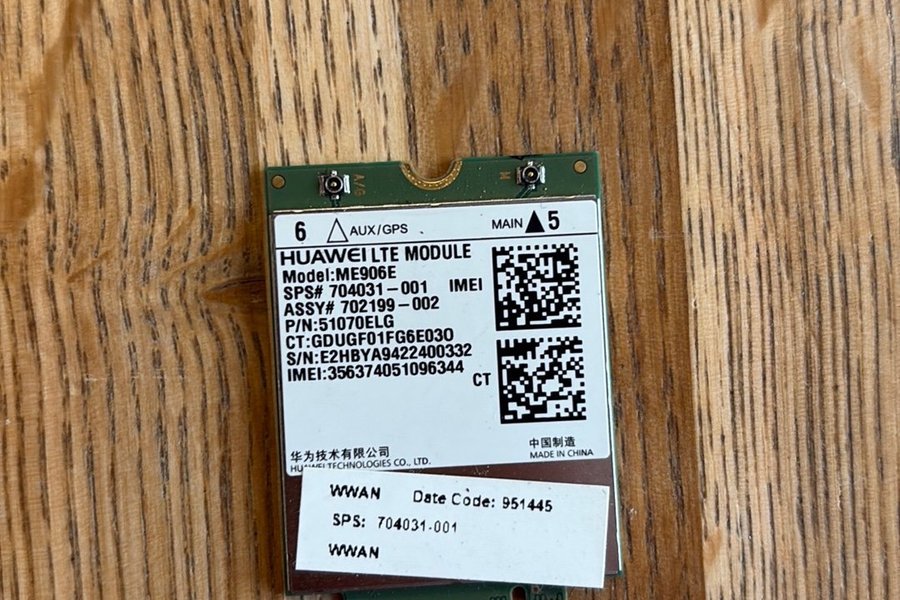 Huawei LTE Module ME906E med SPS# 704031-001 och ASSY# 702199-002. Produktnummer är 51070ELG. Serienummer är E2HBYA9422400332 och IMEI är 356374051096344.