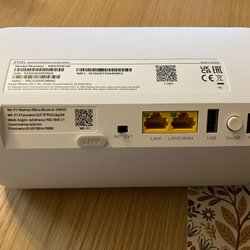 Router med fyra LAN-portar och en koaxialanslutning. Enheten har indikatorlampor för ström, internetanslutning, Wi-Fi och andra funktioner.