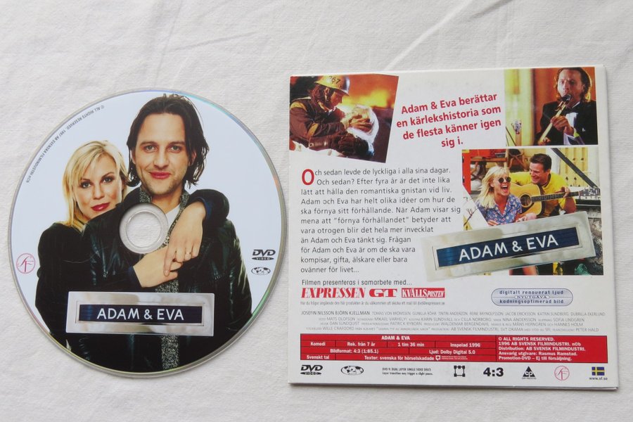 Filmen "Adam & Eva" från 1997 handlar om Adam och Eva som efter fyra år tillsammans upptäcker att den romantiska gnistan har falnat. Adam har idéer om att "förnya förhållandet" vilket leder till komplikationer. Filmen utforskar om de ska förbli vänner, gifta, älskare eller ovänner. Med Josefin Nilsson och Björn Kjellman i huvudrollerna. Regisserad av Måns Herngren och Hannes Holm. Ljud: Dolby Digital 5.0. Bildformat: 4:3 (1:85.1). Texter: svenska för hörselskadade. Speltid: 1 tim 36 min. Rekommenderas från 7 år.
