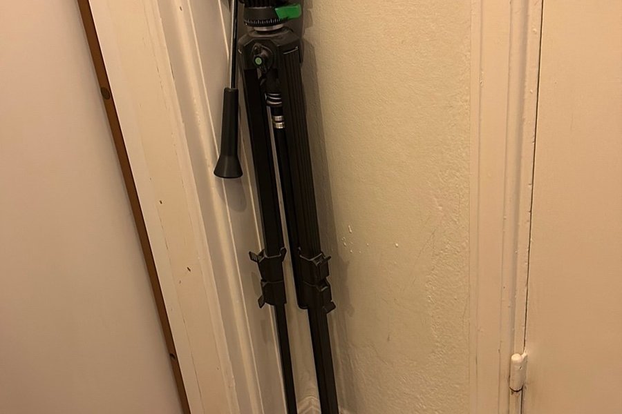 Kamerastativ i svart färg. Stativet har justerbara ben och ett handtag för enkel manövrering.