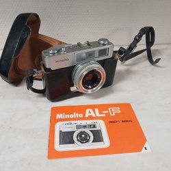 En samling kameror och en blixt. Inkluderar en Fuji DL-7 kompaktkamera med manual, en Dacora Digna kamera, en Braun Hobby 200B blixt med manual och originalförpackning, samt två rullar 35mm film (Fuji Superia 200 och DXN GC 24 exp).