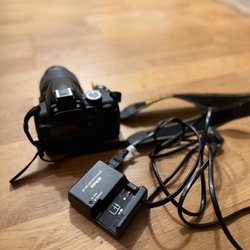Nikon D90 med laddare och objektiv.