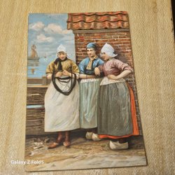 Carte postale représentant une scène de danse de femmes en costumes traditionnels près des dunes. Mention "BRIEFKAART (CARTE POSTALE)" et "Rondedans op de Duinen" imprimées sur la carte.