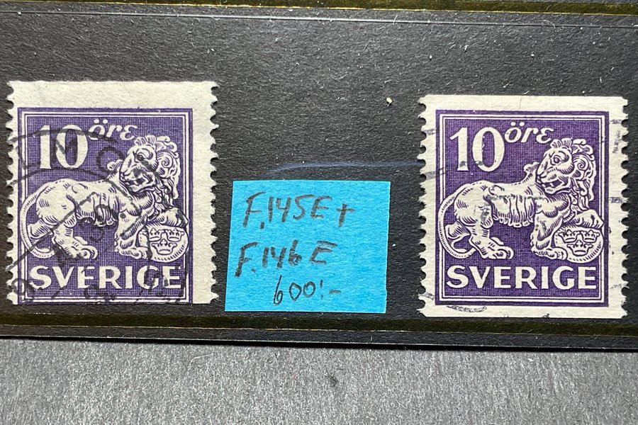 Stämplade Stående lejon t13 10 öre violett F.145e & F.146e (600:-)
