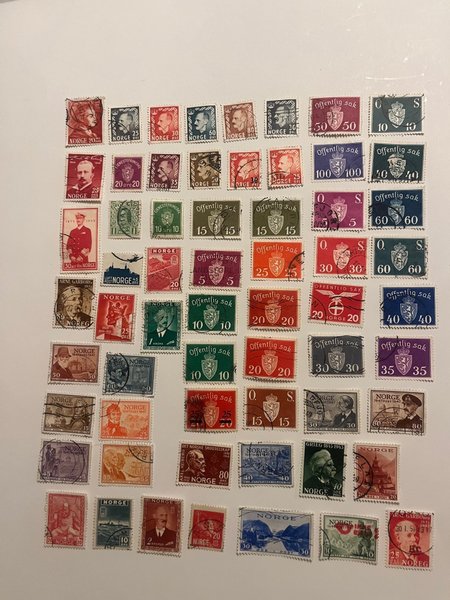 Det här är en större samling norska frimärken (Norge) — mest 1930- till 1960-tal. Du har många kungaporträtt, minnesmärken, motiv samt en hel del Offentlig sak (O.S.) tjänstemärken.