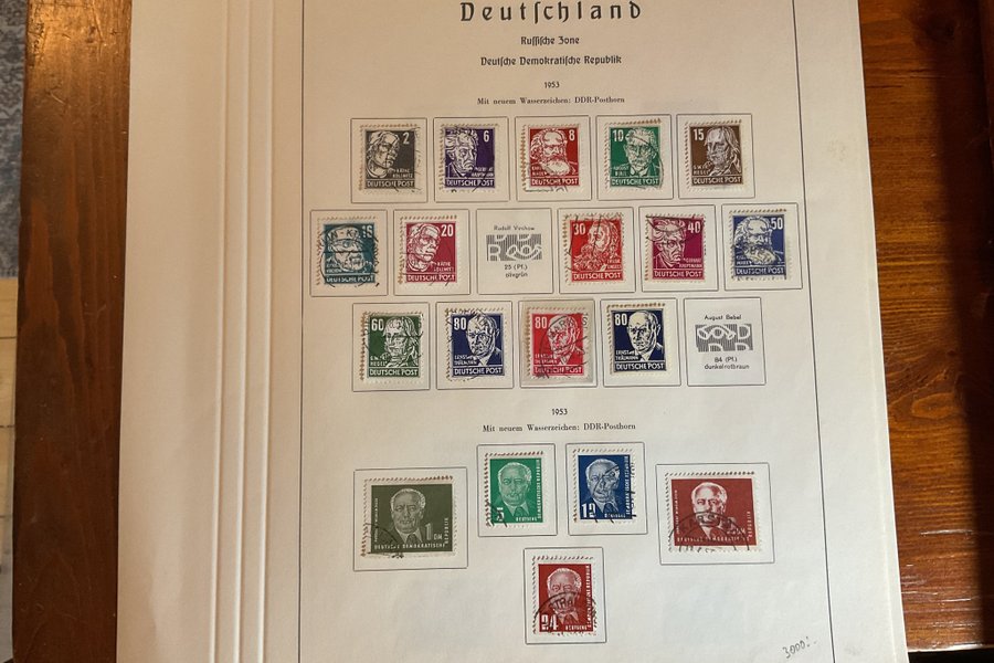 Ett albumblad urtaget ur ett album med stämplade frimärken från DDR 1953.
