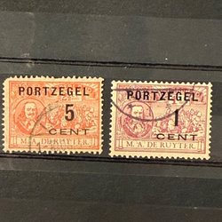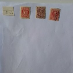 Frimärken, klistrade till papper och stämplade.