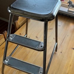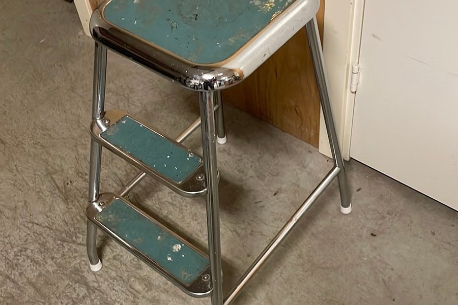 En pall med två steg i metall och turkosfärgade stegytor. Pallen har använts som kökspall och vid målning.