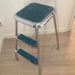 Stegpall med två steg. Praktisk för att nå högre höjder i hemmet. Järntrappa som är lämplig för hemmabruk och för mindre reparationer runt huset, lite rostig men inget allvarligt, mycket användbar. Finns i Stenungsund!