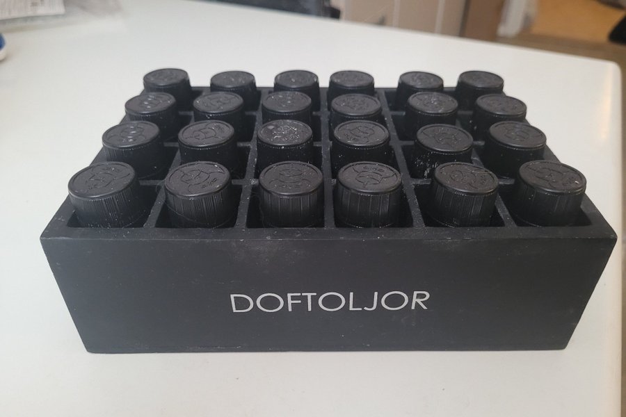 Ett set med 24 doftoljor i ett praktiskt ställ. Perfekt för att organisera och visa upp din samling av doftoljor.