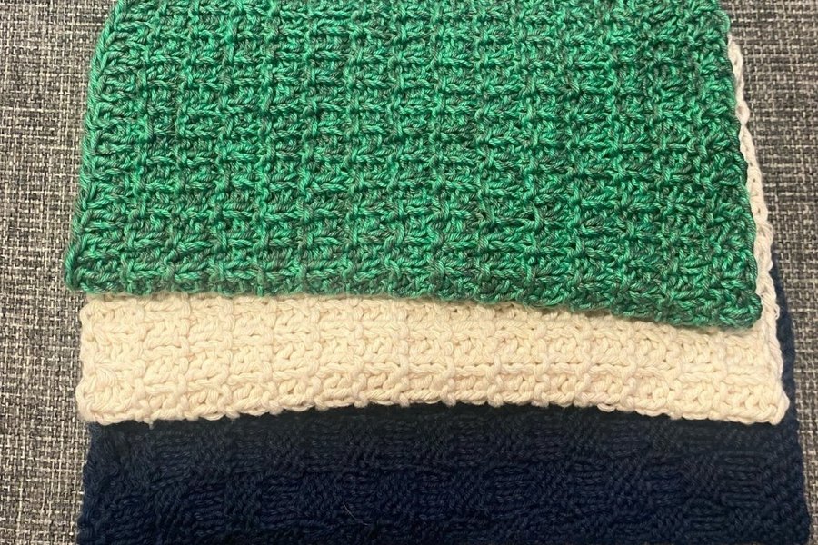 Tre stycken stickade trasor i olika nyanser. Den översta i marinblått, den mellersta i två olika nyanser av grönt och den understa i vitt.