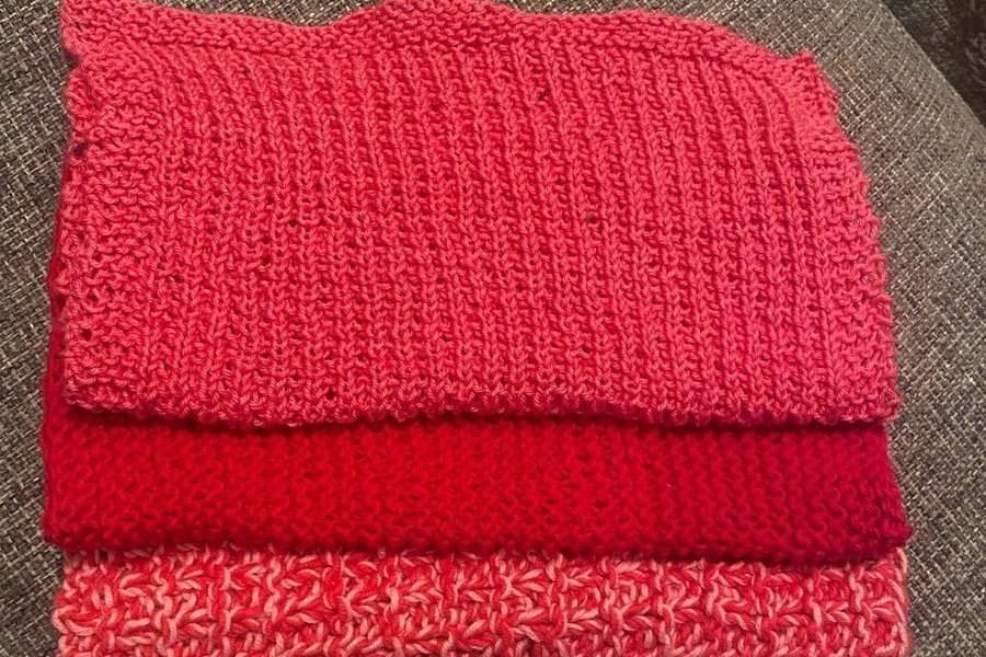 Tre stycken stickade trasor i olika nyanser av rött. Det översta tygstycket är i en ljusare rosa nyans, det mellersta i en mörkare röd nyans och det nedersta i en blandning av rosa och vitt.