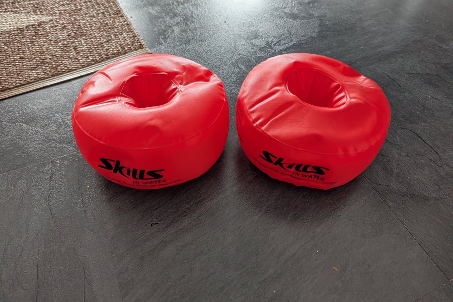 Ett par röda simarmpuffar för barn.