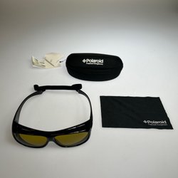 Ett par solglasögon med mörka glas och svart ram.