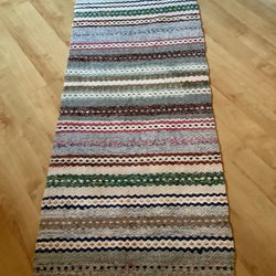 En handvävd trasmatta i gröna och vita nyanser. Mattans mått är 111 x 67 cm.