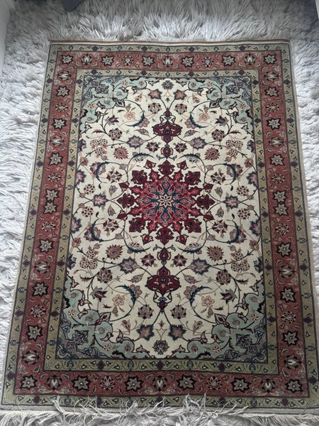 En vacker orientalisk matta med detaljerade blomstermönster och en dekorativ bård.