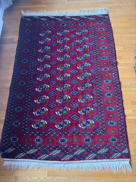 Mattan har ett detaljerat mönster i rött, blått, orange och vitt. Den har fransar i båda ändar.