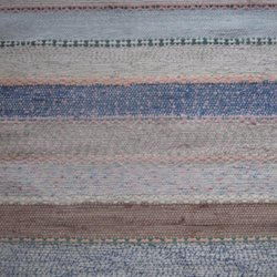 Handvävd trasmatta i blåa och gula nyanser. Mattan har fransar i båda ändar. Passar bra i en hall eller som en färgklick i ett rum.