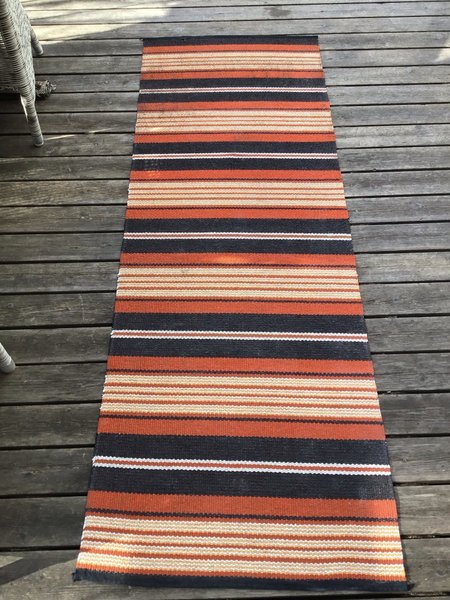En färgglad trasmatta med ränder i orange, svart och vitt. Perfekt för att piffa upp vilket rum som helst!