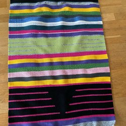 En trasmatta med ränder i olika färger och fransar.