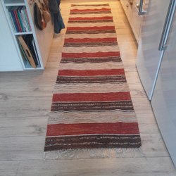 Handvävd trasmatta i bomull med fransar. Mattan har ett randigt mönster i vitt, blått och rött. Den är 76cm bred och cirka 200 cm lång. Smärre fläckar kan förekomma om dem granskas noggrant. Inget som märks i sin helhet.