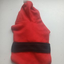 Röd stickad hundtröja med ett vitt snöflingamönster och små röda bollar.