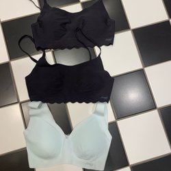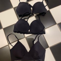 Tre stycken Odd Molly behåar. En svart med blommigt mönster, en enfärgad svart och en enfärgad ljusrosa. Alla har spetsdetaljer och en liten rosett framtill. De har justerbara axelband och knäppning bak med hyskor och hakar.