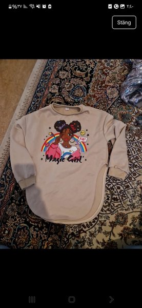 Tröja i en ljus färg med ett tryck av en tecknad figur med texten "Magic Girl" och en regnbåge.