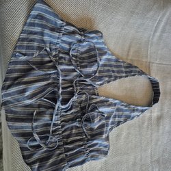 Mörkblå kortärmad blus med v-ringning och dekorativa dragkedjor på axlarna.
