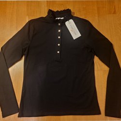 Svart topp med v-ringning och rundad lite längre nedtill bak. Vidd i ärmen nedtill. Storlek Small. Använd men i fint skick.