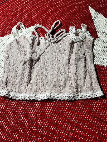 Ljusrosa linne med spetsdetaljer upptill och nedtill. Fint knytband framtill.