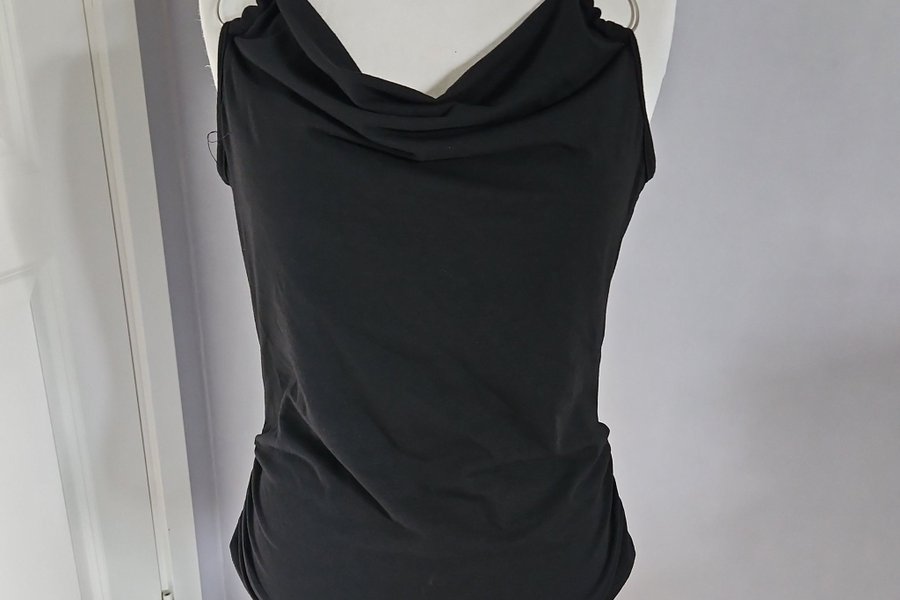 Svart ärmlös topp med draperad halsringning och dekorativa ringar vid axlarna. Toppen har en smickrande passform.