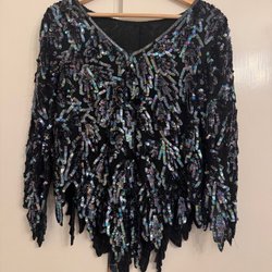 Elegant sort top med pailletter i et bølgemønster. Den har en rund halsudskæring og er uden ærmer. Perfekt til en aften i byen eller en festlig lejlighed.
