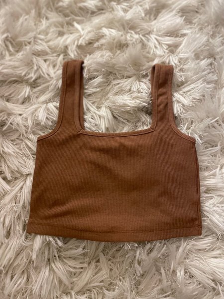 Ljus brun, ribbad crop top med fyrkantig halsringning och breda axelband.