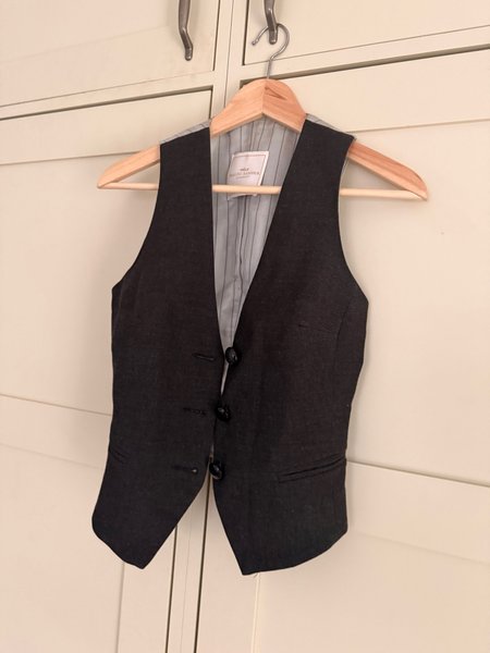 Svart väst med knäppning framtill och en ljusgrårandig insida. Västen har en figurnära passform och en liten ficka på ena sidan.