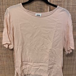 Rosa topp med prickigt tyg vid axlarna och övre delen av bröstet. Kortärmad med volangärmar.