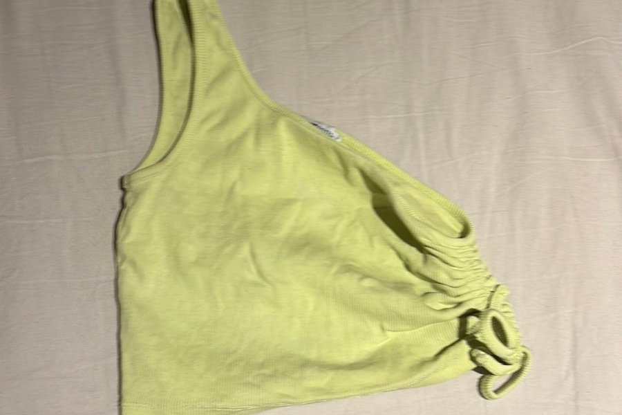 Toppen har en asymmetrisk design med en axel och en dragsko på sidan som skapar en rynkad effekt. Den är i en ljusgul nyans.