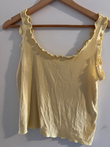 Denne top er en ribbet tanktop i en lys gul farve. Den har flæsekanter langs halsudskæringen og ærmegabene, hvilket giver et legende udtryk. Toppen er ærmeløs og har en klassisk pasform, der gør den velegnet til hverdagsbrug.