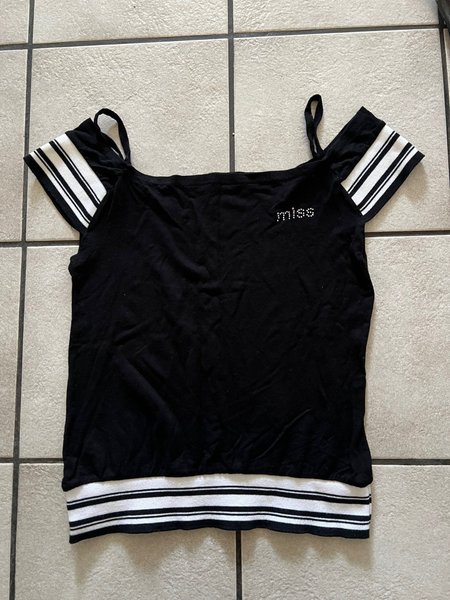 Svart topp med vita ränder på ärmarna och nederkanten. Den har smala axelband och texten ”miss” i strass.
