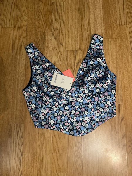 Toppen har ett blommigt mönster i olika nyanser av blått, lila och vitt på en mörk bakgrund. Den har en V-ringning och en figurnära passform med en markerad midja.