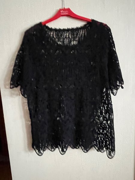 Svart spetstopp med korta ärmar och rund halsringning. Toppen har ett genombrutet mönster och en vågig kant nedtill och vid ärmsluten.