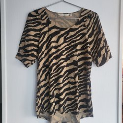 Topp med ett vågigt svart och beige mönster. Den har en V-ringning och korta ärmar. Polyester/viskos/elastan. Har legat nedpackad, ej tvättad. Knappt använd. Köpt på Irland.