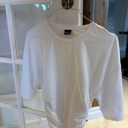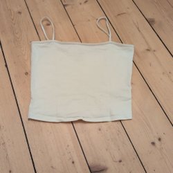 Vit ribbad crop top med spetsdetaljer. Den har smala axelband och en smickrande rynkning framtill.